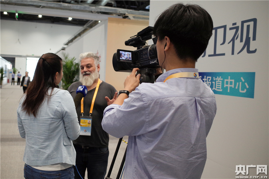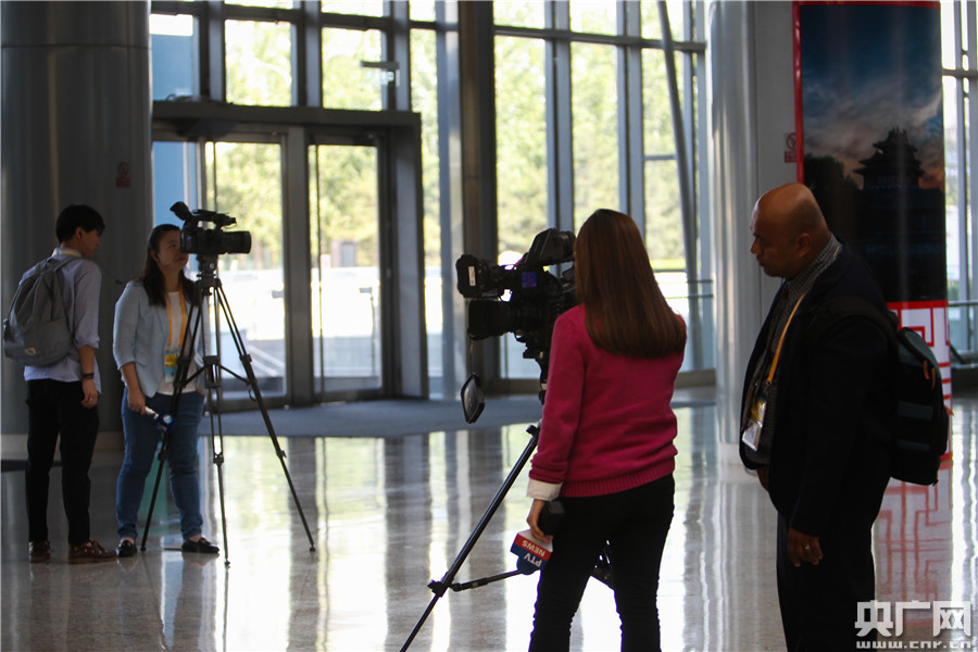 在“一帶一路”國際合作高峰論壇新聞中心內(nèi),記者在進行采訪。(央廣網(wǎng)記者 王永康 攝) -