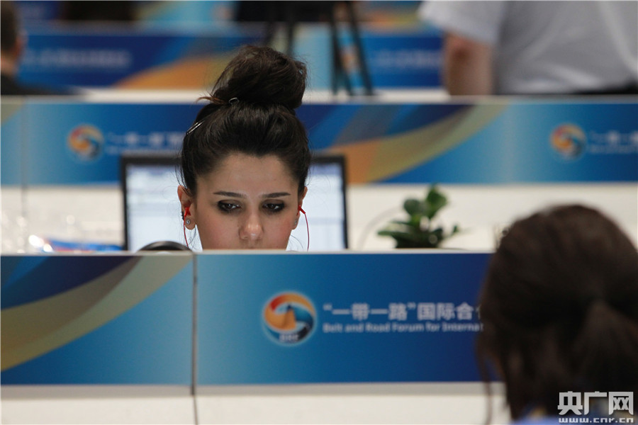 在“一帶一路”國際合作高峰論壇新聞中心內(nèi),一名記者正在工作。(央廣網(wǎng)記者 韓靖 攝) -