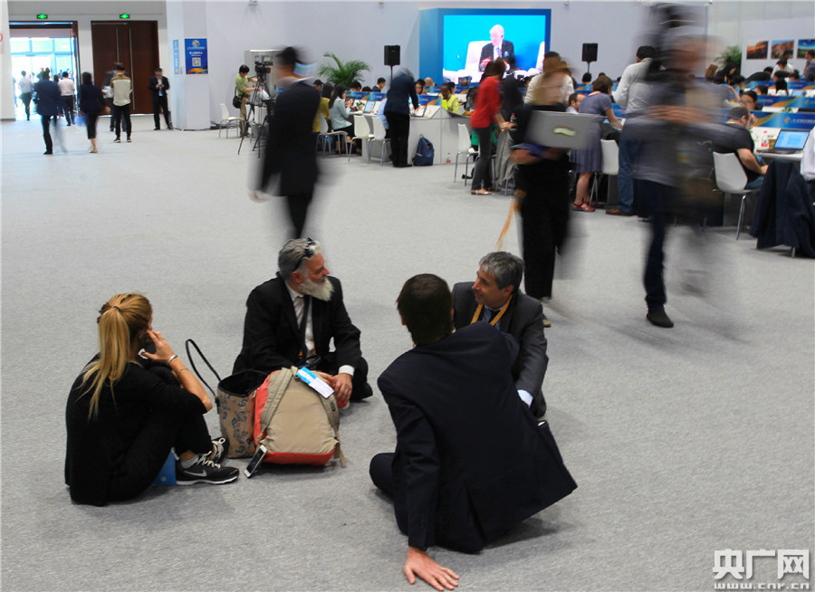 在“一帶一路”國際合作高峰論壇新聞中心內(nèi),記者們席地而坐,交流工作。(央廣網(wǎng)記者 韓靖 攝) -