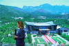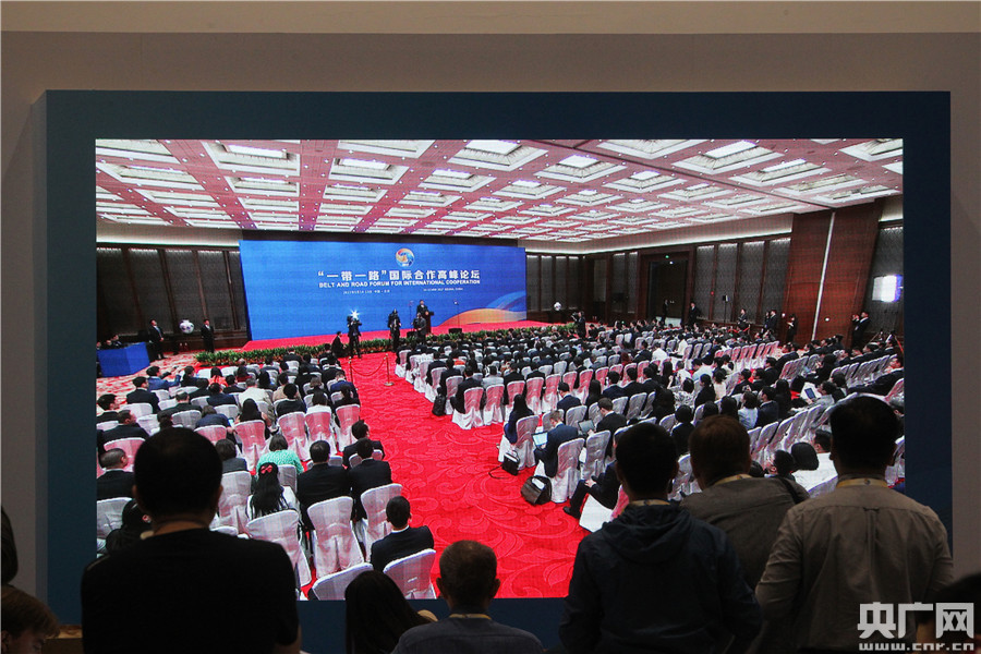 在“一帶一路”國際合作高峰論壇新聞中心內(nèi),一名記者正在背景為北京雁棲湖國際會議中心的電子屏幕前出鏡。(央廣網(wǎng)記者 韓靖 攝) -
