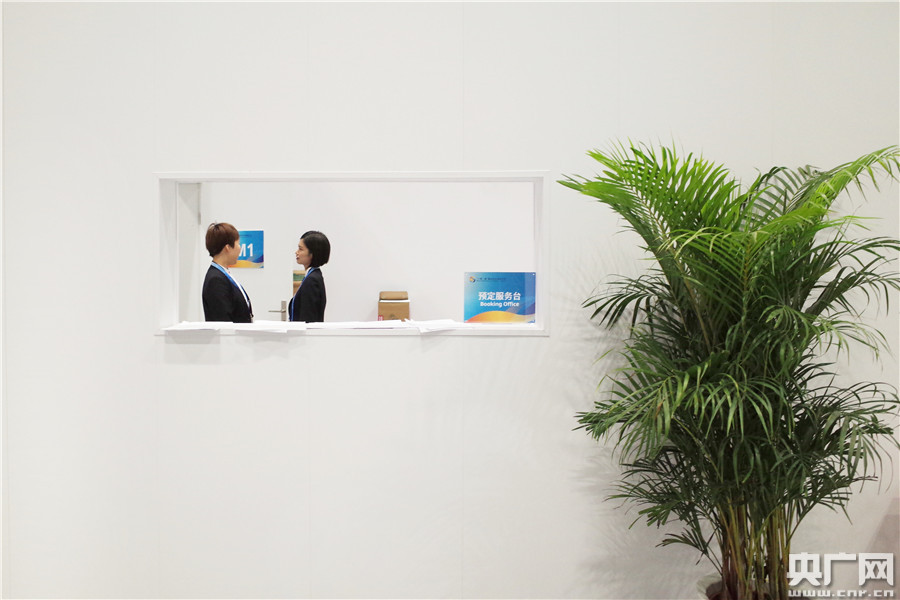 在“一帶一路”國際合作高峰論壇新聞中心內(nèi),兩名工作人員在預訂服務臺窗口交流工作。(央廣網(wǎng)記者 王永康 攝) -