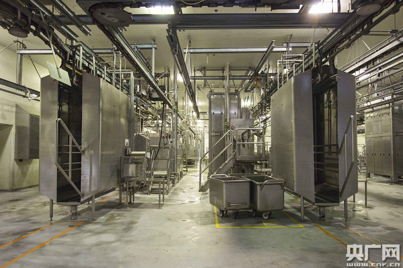 記者隨工作人員進入屠宰車間時,當日的屠宰工作剛完成不久,整個屠宰車間找不到一點殘留的肉制品痕跡,且?guī)缀趼劜坏缴蟮男瘸。負責人告訴記者,屠房內(nèi)設有獨立的生化污水處理系統(tǒng),每天利用細菌及其他微生物處理大約5000立方米的屠宰后污水,確保其水質(zhì)與家居污水相近后才排放,符合環(huán)保標準。