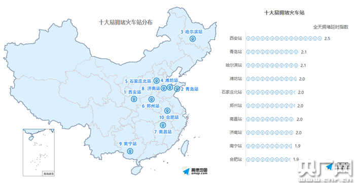 在火車站方面,從高德地圖交通大數(shù)據(jù)預測的全國主要火車站周邊道路擁堵數(shù)據(jù)分析看,十一長假期間,西安站、青島站、哈爾濱站周邊道路擁堵程度最高,其中西安站周邊在十一期間的擁堵延時指數(shù)達到了2.5,青島站和哈爾濱站也達到了2.1,出行所需花費的時間成本較大。