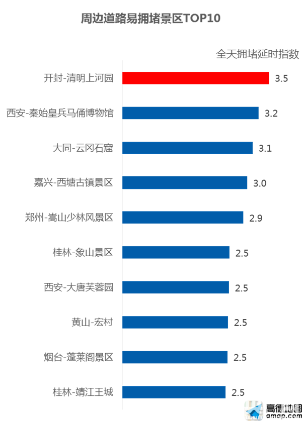 同時,預計十一黃金周期間,開封清明上河園周邊道路最為擁堵, 10月2日至7日的8:00~19:00時段擁堵最為突出。