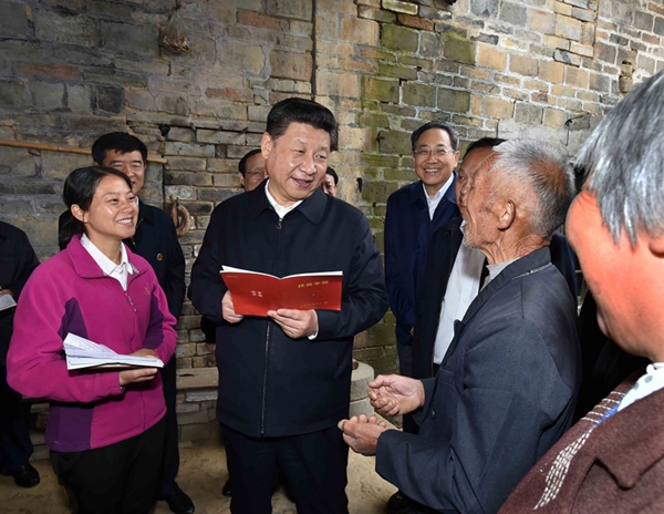 4月24日下午,習(xí)近平在六安市金寨縣花石鄉(xiāng)大灣村村民汪能保家中察看扶貧手冊。新華社記者 李濤 攝