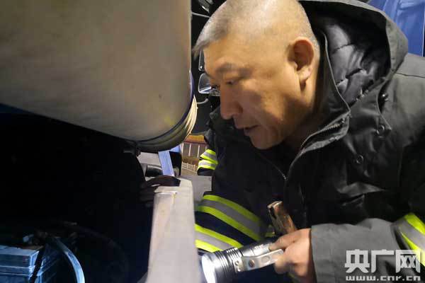 初一早上5時(shí),北京環(huán)衛(wèi)集團(tuán)天安門環(huán)境服務(wù)中心郭德明師傅在進(jìn)行出車前的檢查。