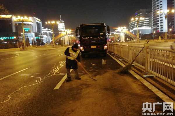 2月16日(初一)凌晨1時(shí)許,北京環(huán)衛(wèi)集團(tuán)北京機(jī)掃公司職工在清理路面油污。