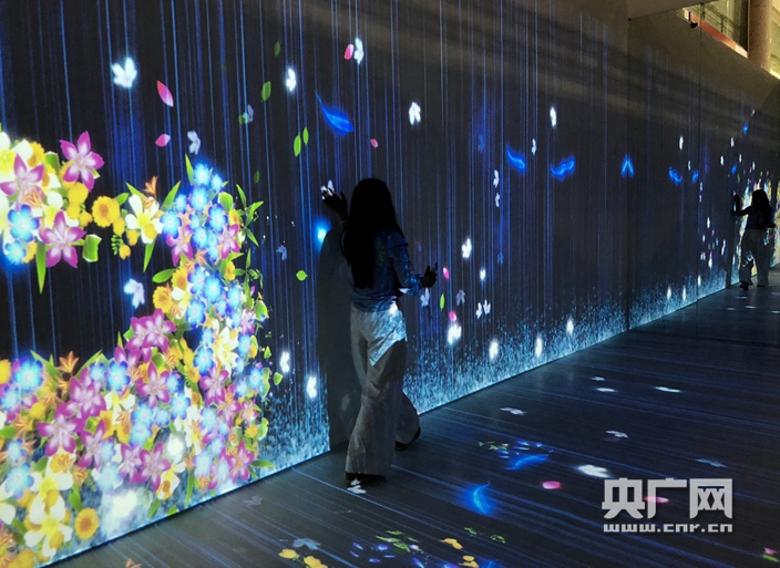 在沉浸式VR體驗(yàn)區(qū),工作人員觸摸屏幕,指尖便開(kāi)出姹紫嫣紅的花朵。