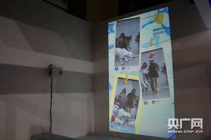 AR互動(dòng)拍照區(qū)里,游客揮動(dòng)雙手,憨態(tài)可掬的北極熊便出現(xiàn)在屏幕中,與人們拍照互動(dòng)。戴上可愛(ài)的圣誕帽,與北極熊親密擁抱,還有一條酷似史努比的小狗在一旁撒歡兒,點(diǎn)一下拍照按鈕,這一畫(huà)面便定格下來(lái)。