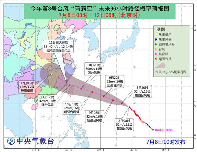 今年第8號(hào)臺(tái)風(fēng)“瑪莉亞”未來96小時(shí)路徑概率預(yù)報(bào)圖(圖片來源:中國氣象報(bào)社)