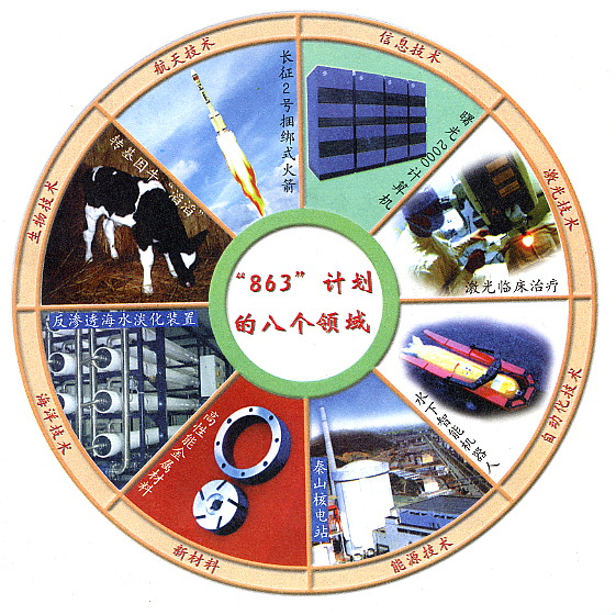 1986年3月提出的863計(jì)劃,在經(jīng)過一百多位科學(xué)家半年多的反復(fù)論證,形成為《863計(jì)劃綱要》,選擇生物技術(shù)、航天技術(shù)、信息技術(shù)、激光技術(shù)、自動化技術(shù)、能源技術(shù)和新材料七個領(lǐng)域作為我國發(fā)展高科技的重點(diǎn),1996年又將海洋高技術(shù)列為計(jì)劃的第八個領(lǐng)域。