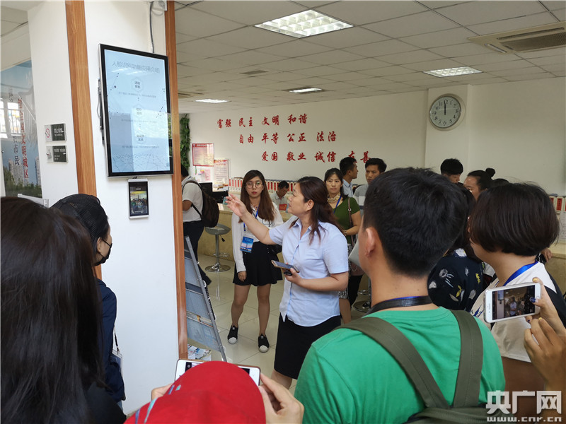 華納社區(qū)黨委書記劉紅霞向記者介紹人臉識別系統(tǒng),居民可通過“刷臉”參加社區(qū)活動簽到、預(yù)約社區(qū)活動場地,實(shí)現(xiàn)免證件辦理等業(yè)務(wù)。(央廣網(wǎng)記者 梁爽 攝)