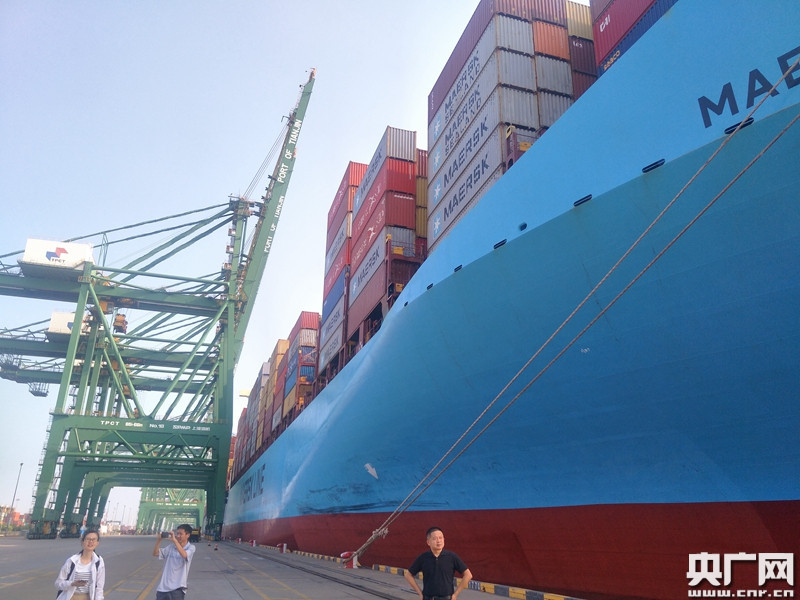 一輛輛集裝箱卡車魚貫穿梭在碼頭與堆場之間,將大批進(jìn)出口貨物送到整裝待發(fā)的國際集裝箱巨輪前。(央廣網(wǎng)記者 王晶 攝)