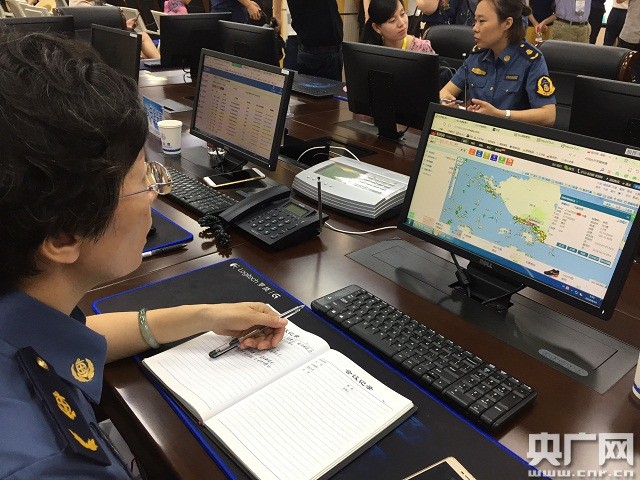 舟山市港航局工作人員正在對船舶進行實時監(jiān)控(央廣網(wǎng)記者 王曉蕾 攝)