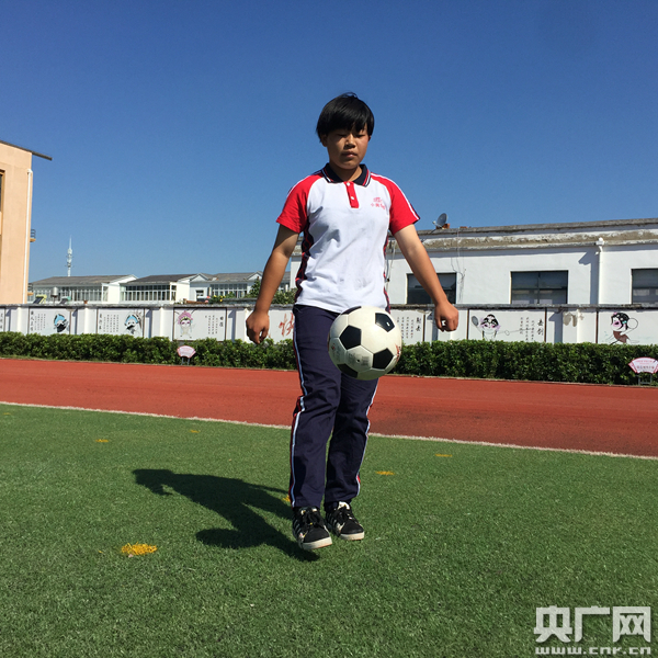 靦腆的笑容、一把馬尾辮,這些特征來自一名少年足球“小將”——小崗學校女子足球隊隊員章燦燦。記者見到她時,她正和隊友們一起在學校的操場上練習墊球。