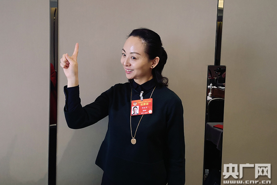 全國政協(xié)委員、中國殘疾人藝術團團長邰麗華正在用手語回答記者提問。(央廣網記者 張瓊文 攝)