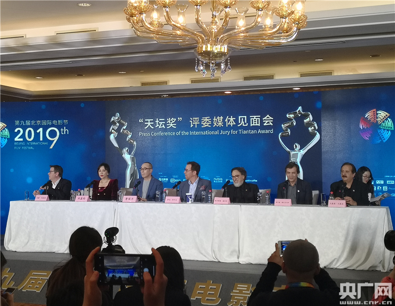 第九屆北京國際電影節(jié)主競賽單元“天壇獎”國際評委會會全體成員集體亮相。(央廣網(wǎng)記者 劉一荻 攝)