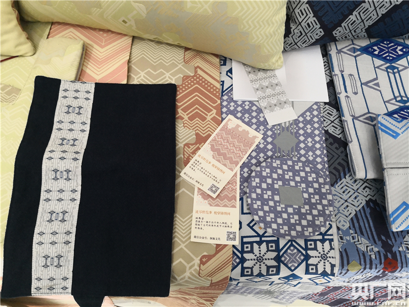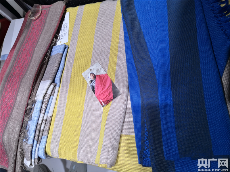 記者注意到,每一件充滿民族特色的織品中都夾著一張這樣的小卡片。(央廣網(wǎng)記者 劉一荻 攝)