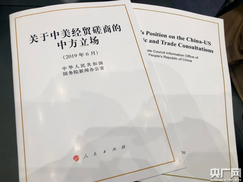 據(jù)了解,《關(guān)于中美經(jīng)貿(mào)磋商的中方立場》白皮書以中、英、法、俄、德、西、阿、日等8個語種發(fā)表,由人民出版社、外文出版社分別出版,在全國新華書店發(fā)行。