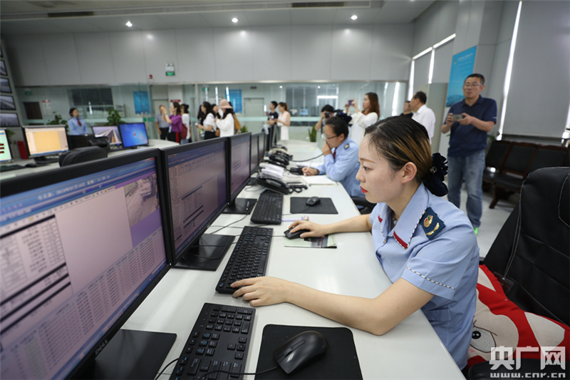 膠州灣大橋監(jiān)控調(diào)度中心內(nèi)工作人員正在進行呼叫接聽工作。(央廣網(wǎng)記者 韓靖 攝)