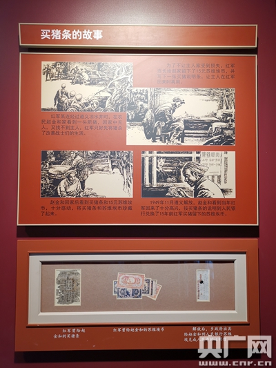 貴州省遵義市中華蘇維埃共和國(guó)國(guó)家銀行舊址墻上展示的買(mǎi)豬條故事(央廣記者熊逸攝)