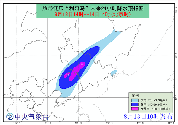 臺風勢力雖減弱,但由于受“利奇馬”和冷空氣共同作用,13日14時至14日14時,黃海北部、渤海海峽、渤海將有6-7級大風,部分海域陣風8-9級;遼寧中部、內蒙古東南部、吉林中部和東北部、黑龍江中部等地的部分地區(qū)有大雨或暴雨,其中遼寧北部、吉林中部、內蒙古東南部等地的部分地區(qū)還將有大暴雨(100~130毫米)。氣象專家提醒以上地區(qū)的民眾們,出行前及時查閱天氣預報,做好防范。