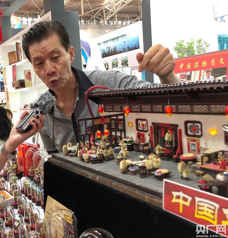 來(lái)自河南的朱先生一家在一個(gè)展位前停留了很長(zhǎng)時(shí)間,他們馬上要出國(guó)旅行,正在為外國(guó)朋友挑選幾件小禮物,最終,他們挑選了兩只“小猴子”。原來(lái),這些棗核大小的“小猴子”,是列入中國(guó)非物質(zhì)文化遺產(chǎn)名錄的民間手工藝術(shù),叫“毛猴”,它們的四肢是用蟬蛻(蟬褪下的空殼)做的,而身子是由一味叫做“辛夷”的中藥塑成,一個(gè)個(gè)小毛猴被手工藝人塑出各種生動(dòng)的動(dòng)作神態(tài),表達(dá)著諸如“長(zhǎng)壽”“吉祥”“孝順”“幸!钡纫庀蟆
