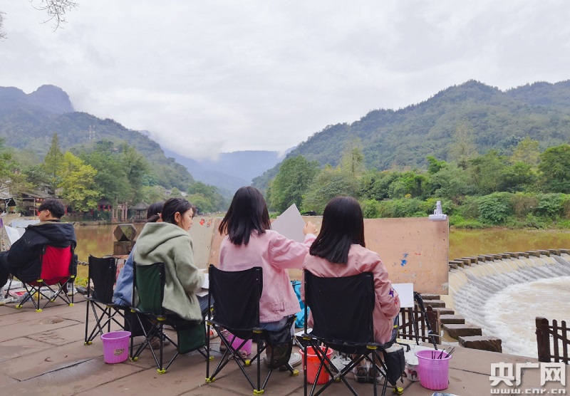 藝術(shù)院校的學(xué)生在柳江古鎮(zhèn)寫生(央廣網(wǎng)記者 陳銳海 攝)
