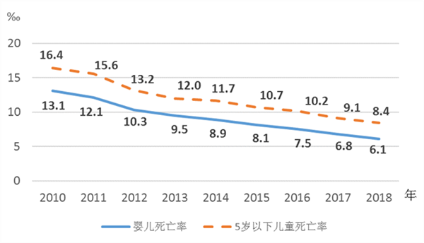 2018年,全國城市嬰兒死亡率為3.6‰,農(nóng)村嬰兒死亡率為7.3‰,農(nóng)村高于城市1倍多。5歲以下兒童死亡率城市為4.4‰,農(nóng)村為10.2‰,農(nóng)村高于城市1.3倍。5歲以下兒童死亡率區(qū)域間差距也較大,西部高于東部2倍。