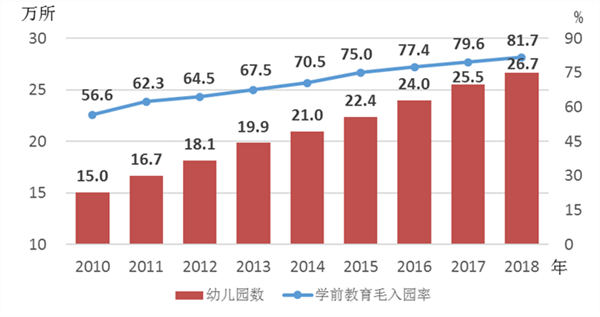 2010—2018年幼兒園數(shù)及學(xué)前教育毛入園率情況(央廣網(wǎng)發(fā) 國家統(tǒng)計局供圖)