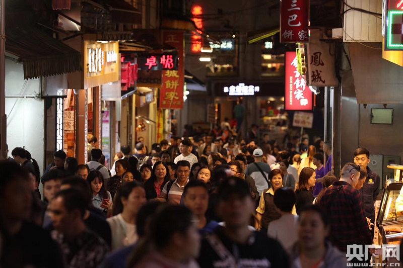 入夜,位于大三巴牌坊附近的手信街,人流如織(央廣網(wǎng)記者 韓靖 攝)