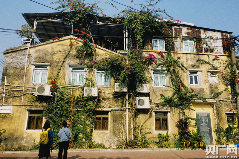 在佛笑樓左轉(zhuǎn),便可進入有紅色建筑和百葉窗的福隆新街(央廣網(wǎng)記者 王晶 攝)