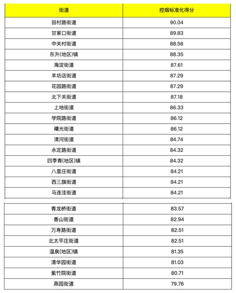 截至12月17日,北京市海淀區(qū)各街鄉(xiāng)控煙指數(shù)(央廣網(wǎng)發(fā) 北京市控煙協(xié)會供圖)