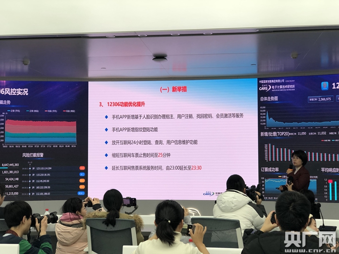 在記者參觀的時段內(nèi),平均每秒鐘能售出300多張車票。移動端購票的比例占到78%,PC端占22%。高峰日時,12306網(wǎng)絡(luò)點擊量高達1495億次。