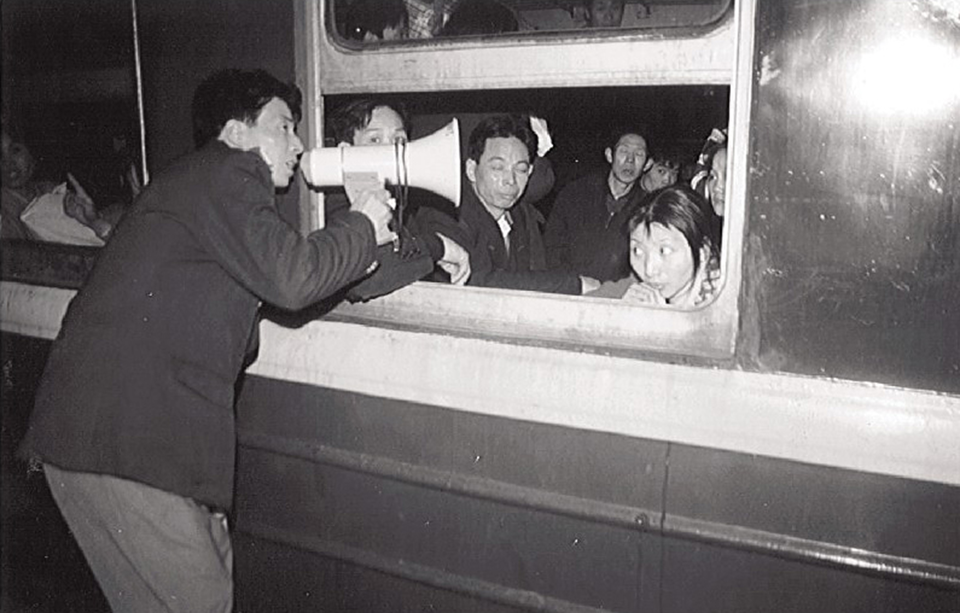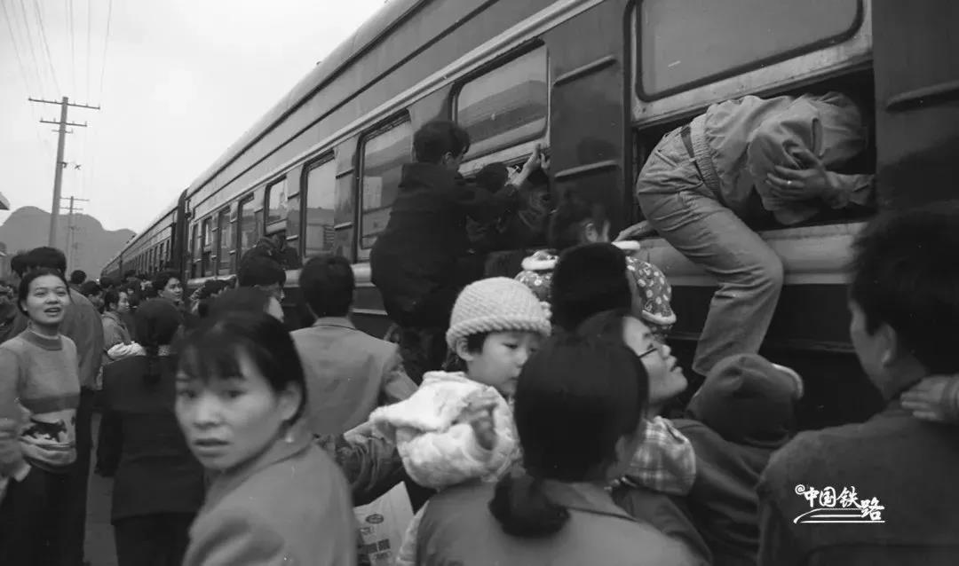 1998年,湘桂線鳳凰站,沒能從車門擠進去的旅客干脆從車窗爬進列車(中國鐵路供圖 蔣建雄 攝)