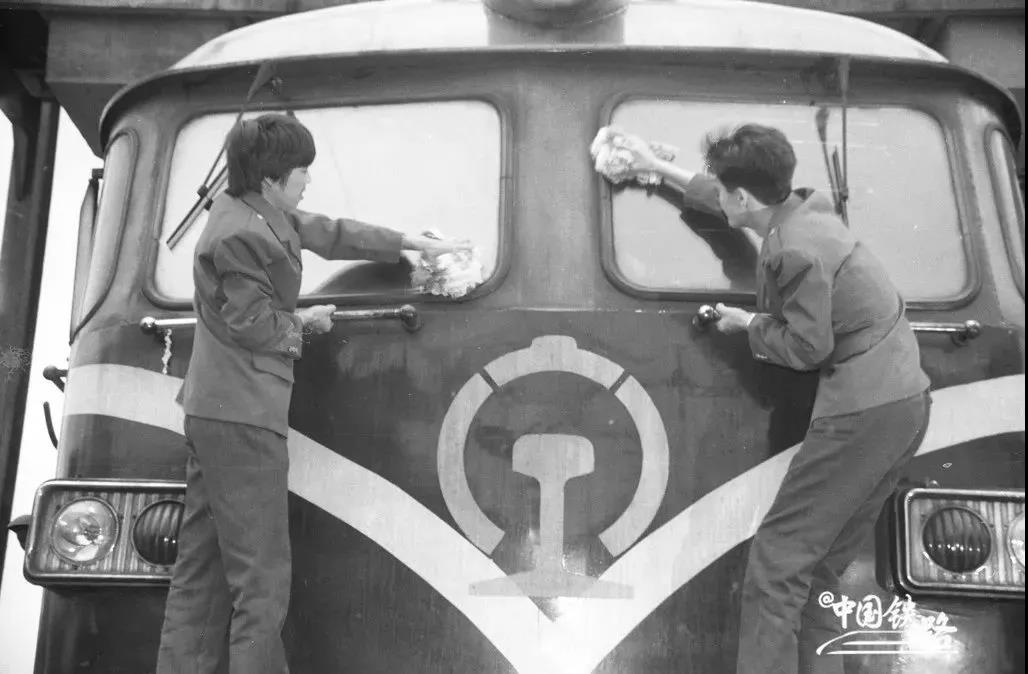 上世紀90年代,機務段乘務員下班前擦拭東風4型內(nèi)燃機車(中國鐵路供圖)