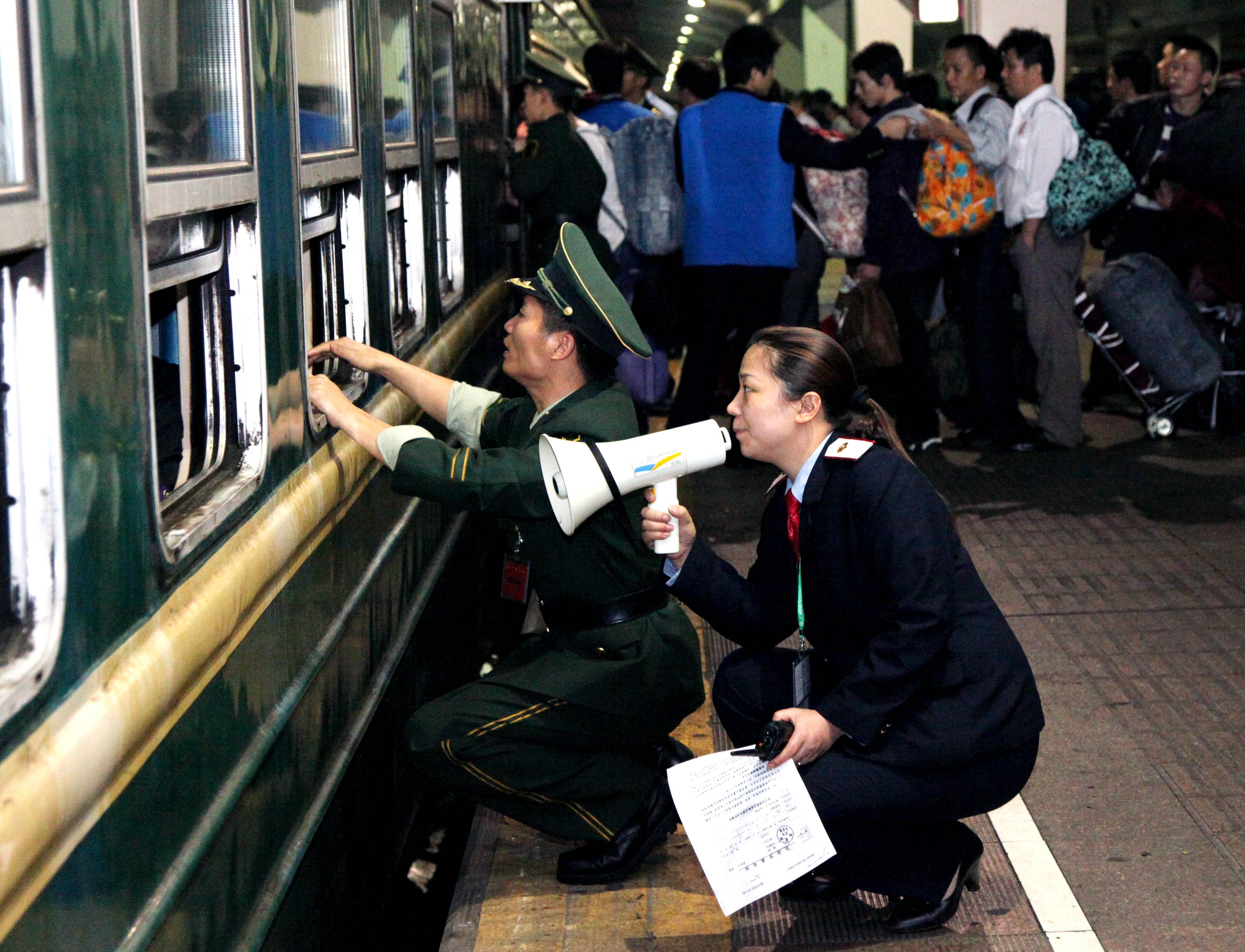 2010年春運,2月2日晚,廣州站正在組織綠皮車臨客乘車(廣州鐵路供圖)