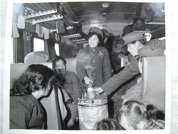 1976年春運,長沙客運段長京二組列車員劉朝鮮在車廂用新上的茶水車給旅客送開水(廣州鐵路供圖)
