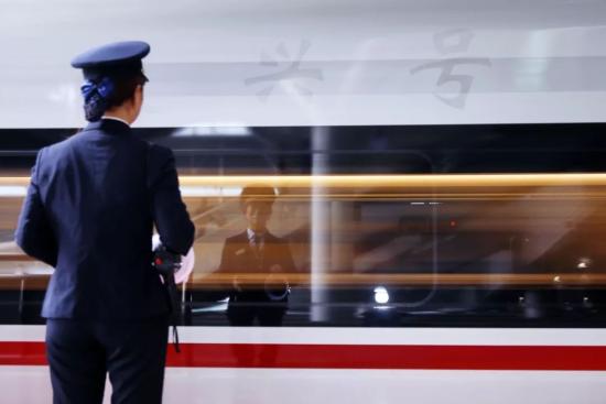 2019年1月21日,深圳北站一列開往香港的復興號動車組啟動,客運值班員正在進行送車作業(yè)(中國鐵路供圖)