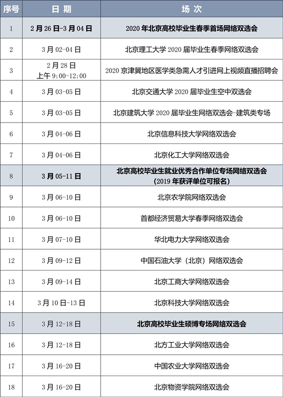 2020屆高校畢業(yè)生網(wǎng)絡(luò)雙選會(huì)系列活動(dòng)部分場(chǎng)次安排表(央廣網(wǎng)發(fā) 來源:北京市教委)