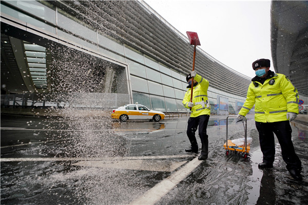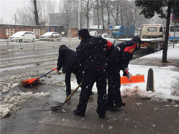 北京南站交警隊(duì)安排專人值守站區(qū)高架橋梁、急彎等危險(xiǎn)路段,及時(shí)對(duì)結(jié)冰路段拋灑融雪鹽,對(duì)路面積雪進(jìn)行不間斷清除,確保進(jìn)站道路正常通行。