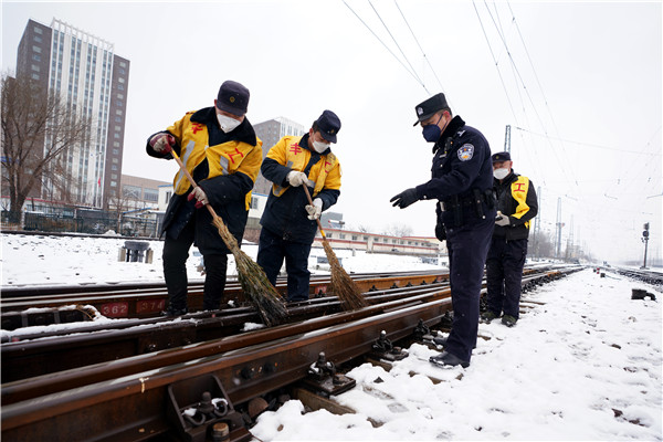 鐵警及時(shí)清掃鐵軌上的積雪(北京鐵路公安處供圖)