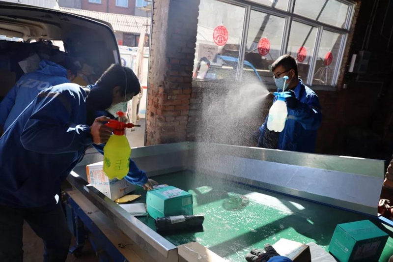 在快遞網(wǎng)點,工作人員正在逐一對快件進行消毒(央廣網(wǎng)發(fā) 中通快遞供圖)