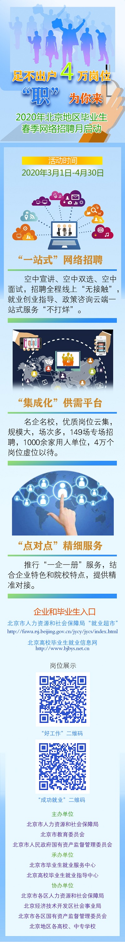 央廣網(wǎng)北京2月29日消息(記者劉一荻)記者今日(29日)獲悉,為做好疫情防控期間北京地區(qū)2020屆畢業(yè)生就業(yè)工作,北京市人力資源和社會(huì)保障局、市教委和市國(guó)資委聯(lián)合舉辦“2020年北京地區(qū)畢業(yè)生春季網(wǎng)絡(luò)招聘月活動(dòng)”。活動(dòng)將于3月1日啟動(dòng),持續(xù)2個(gè)月,預(yù)計(jì)將有千余家用人單位推出4萬(wàn)余個(gè)畢業(yè)生就業(yè)崗位。