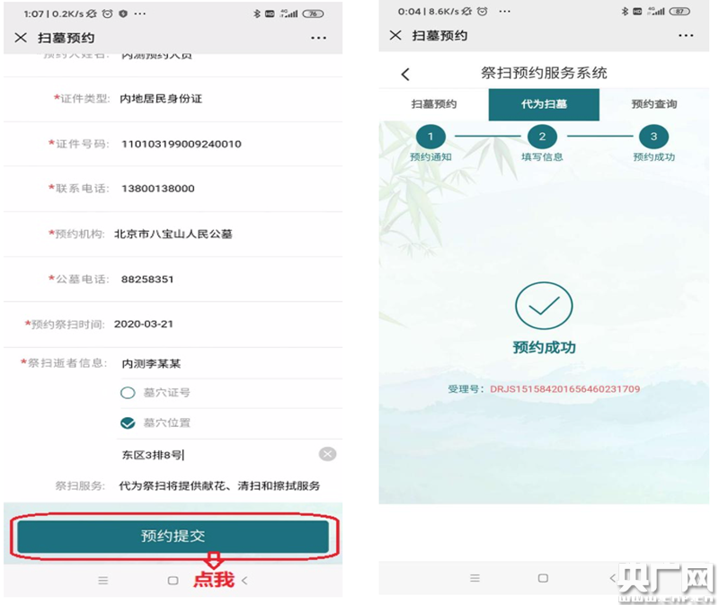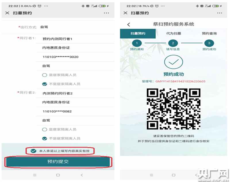 點擊“預約提交”按鈕完成祭掃預約,系統(tǒng)將自動生成二維碼(北京市民政局供圖)