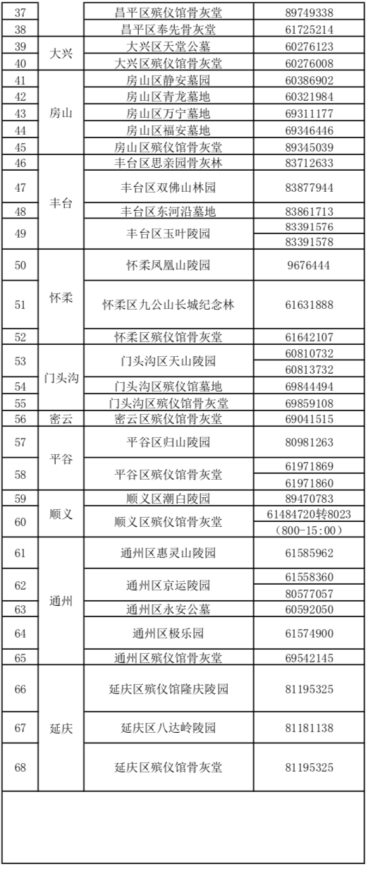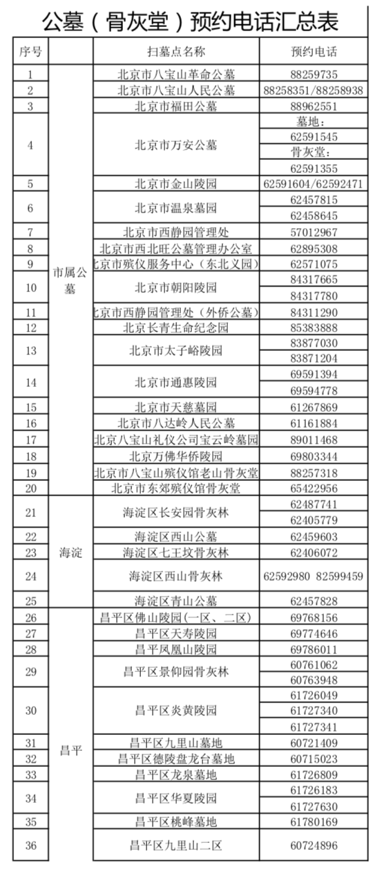 公墓(骨灰堂)預約電話匯總表(北京市民政局供圖)