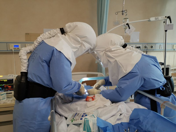經(jīng)過與負(fù)責(zé)ICU的北京協(xié)和醫(yī)院援助湖北團(tuán)隊會診,3月2日,張心浩與同事龍小博為劉英實施了氣管切開手術(shù)。