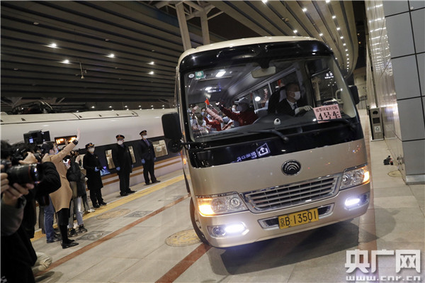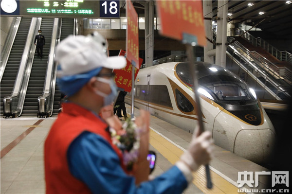 隨著G68次列車平穩(wěn)開進(jìn)北京西站,北京迎回第一支從武漢凱旋的醫(yī)療隊(央廣網(wǎng)記者 張凱航 攝)