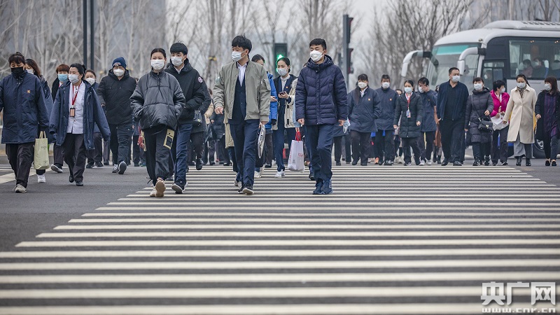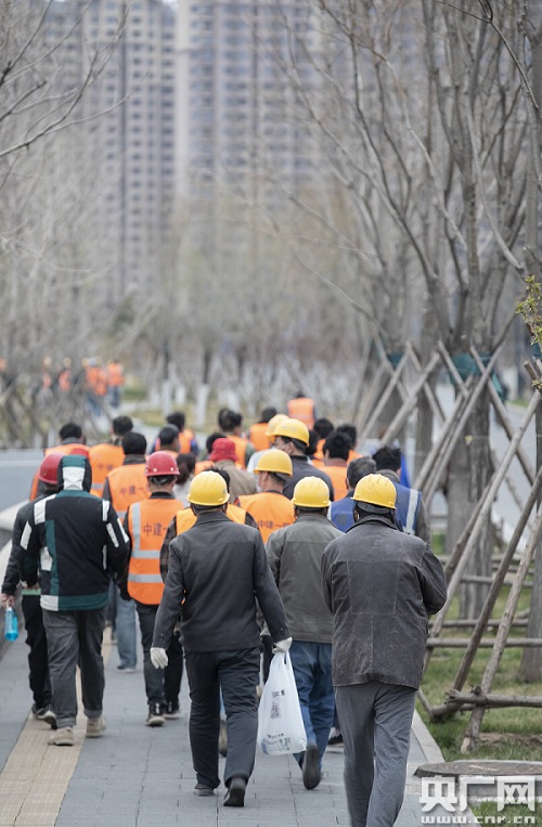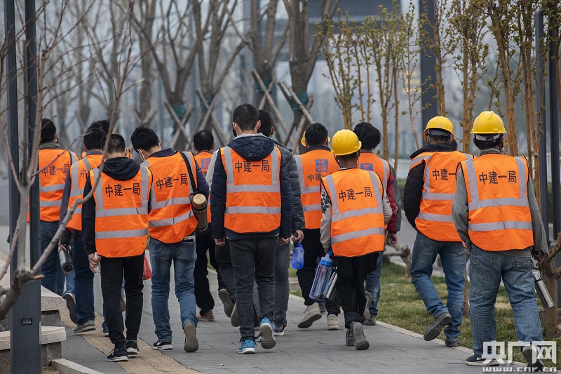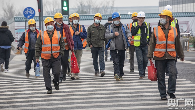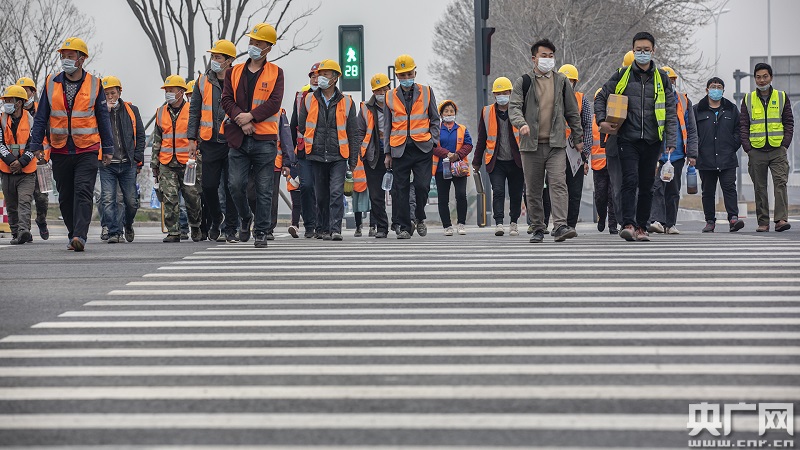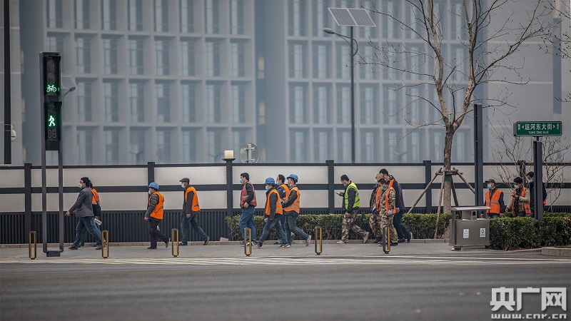 工人們正前往副中心某建設(shè)項(xiàng)目(央廣網(wǎng)記者 張佳琪 攝)