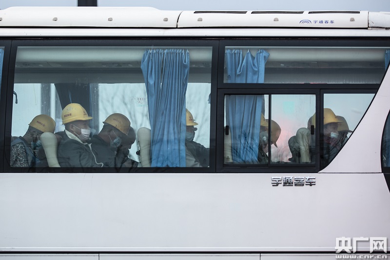 工人們乘坐大巴前往各自的建設(shè)項(xiàng)目(央廣網(wǎng)記者 張佳琪 攝)